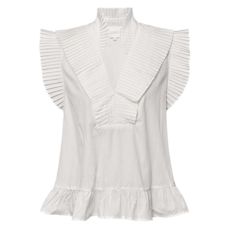 Skøn top fra Gossia. Toppen har dyb V-udskæring og de fineste plissé flæser ved hals, krave og ærmegab. Materiale: 60% Polyester. 40% Bomuld. Vaskeanvisning: Vaskes ved 30 grader.