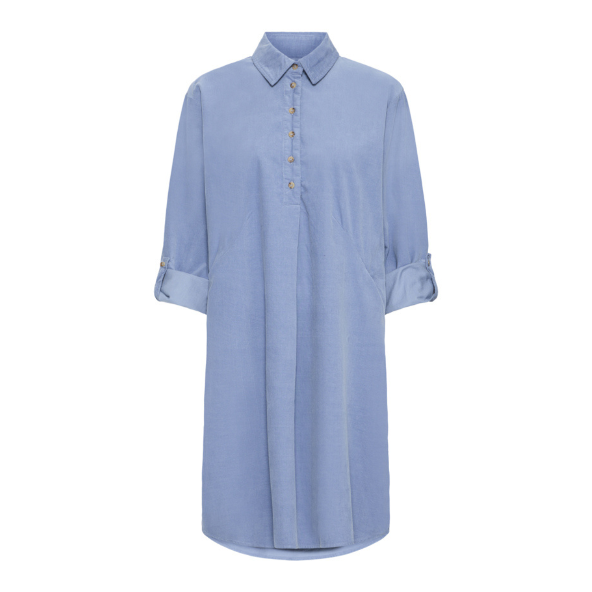 Sød fløjlskjole fra Fransa. Kjolen har skjortekrave, lange ærmer, lommer i siden, er knælang samt løs i pasformen. Materiale: 100% Bomuld. Vaskeanvisning: Vaskes ved 30 grader.