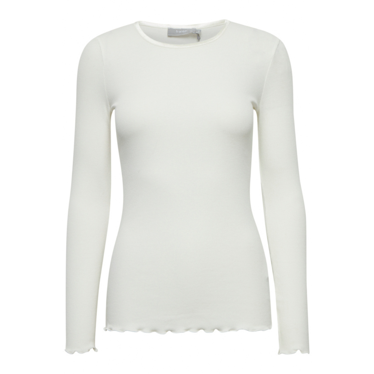 Sød t-shirt fra Fransa. Den har en rund halsudskæring, lange ærmer, en tætsiddende pasform samt fine flæsedetaljer ved ærmeafslutningerne og bunden af t-shirten.