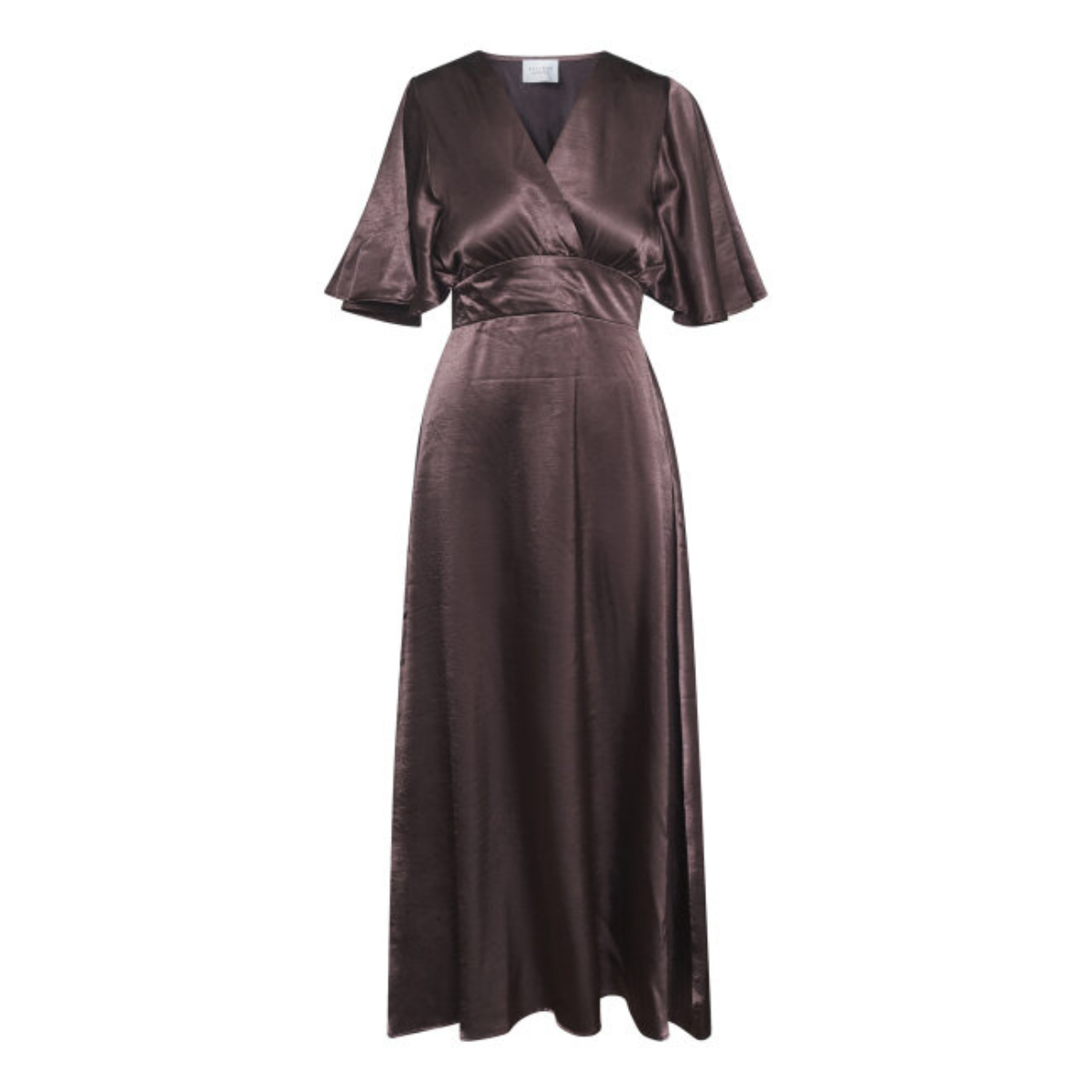 Elegant kjole fra SisterS Point. Kjole er lang samt i en glat og skinnende kvalitet. Kjolen har en V-halsudskæring med slå-om-effekt, korte flagermusærmer og en bred linning i taljen.