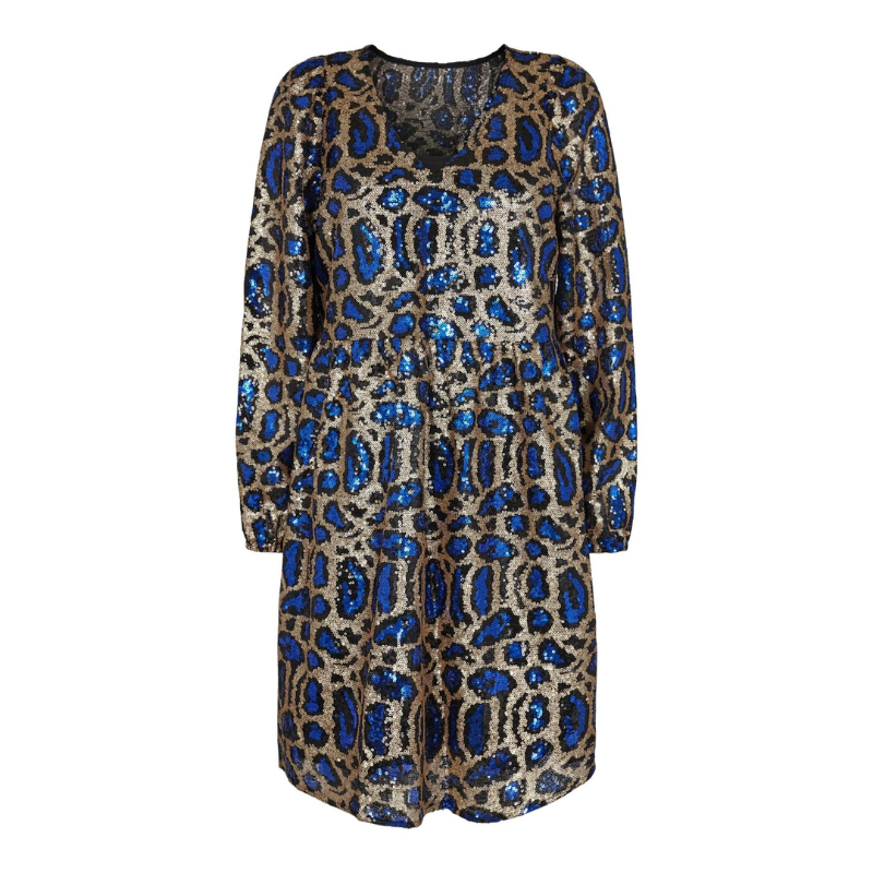 Super smuk kjole fra Liberté. Denne kjole har V-udskæring, lange ærmer med elastik og et super cool mønster med en masse palietter. Kjolen har en sort inderkjole.