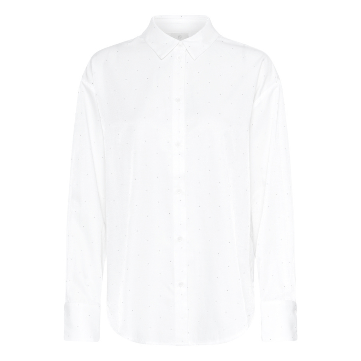 Pæn skjorte fra Kaffe. Skjorten er gennemknappet, har skjortekrave, lange ærmer med manchet samt rhinsten fordelt på hele skjorten.