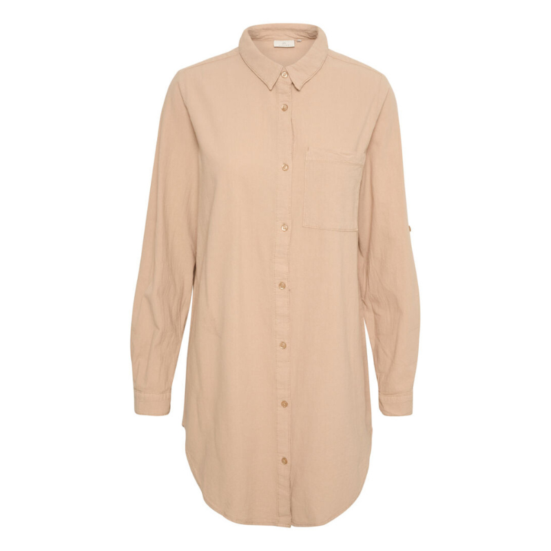 Cool skjorte fra Kaffe. Skjorten har lidt længde, lange ærmer som kan foldes op og sættes i en knap, en brystlomme, og er gennemknappet. Kan styles med de matchende bukser.