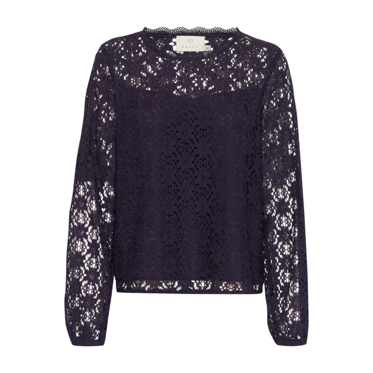 Fin bluse fra Kaffe. Blusen har en rund hals og lange brede ærmer med elastik forenden. Derudover har den en fin blonde med et indbygget lag ved både brystet og maven samt ryggen.