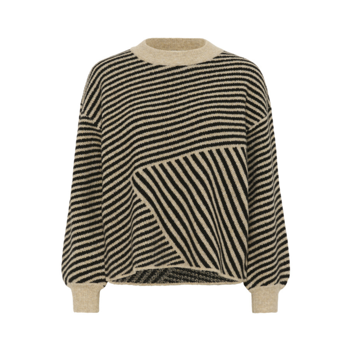 Smuk strikbluse fra Kaffe. Den har rund hals, er løs i pasformen, har et flot stribet mønster samt ribkant detaljer ved kraven og håndledet. Materiale: 46% Akryl. 45% Nylon. 5% Uld. 4% Elastan. Vaskeanvisning: Vaskes ved 30 grader.