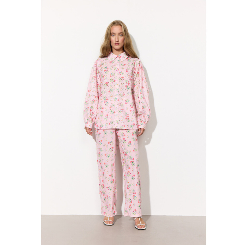 Super fin skjorte fra HunKøn. Skjorten er gennemknappet, har brede ærmer med et let rynk ved manchetterne og er længere bagpå med slids i begge sider. Derudover har den et fint broderet blomsterprint med hulmønster. Kan styles med matchende buks. Materiale: 100% Polyester. Vaskeanvisning: Vaskes ved 30 grader.