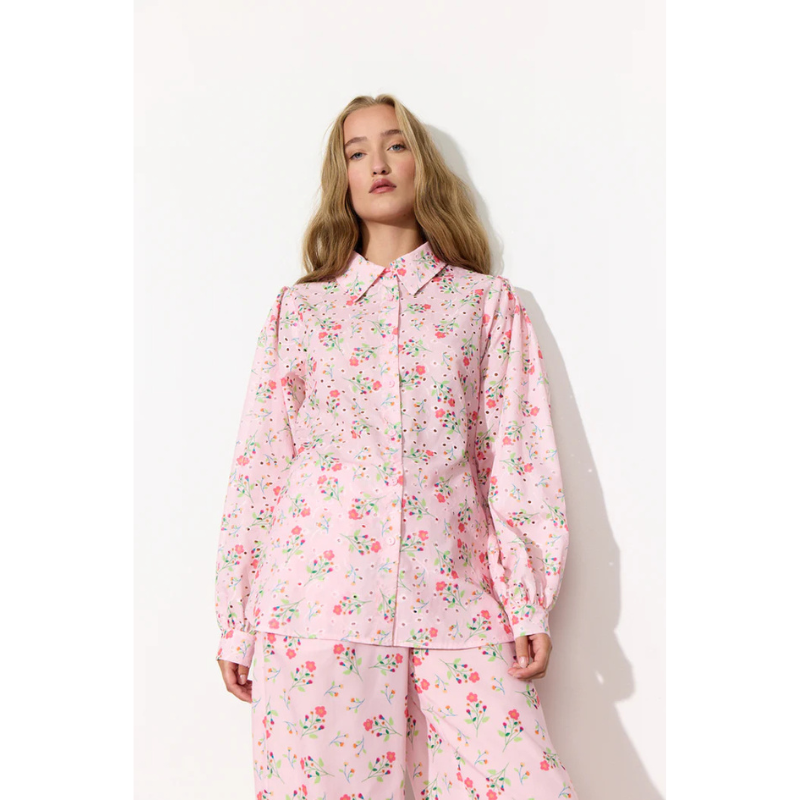 Super fin skjorte fra HunKøn. Skjorten er gennemknappet, har brede ærmer med et let rynk ved manchetterne og er længere bagpå med slids i begge sider. Derudover har den et fint broderet blomsterprint med hulmønster. Kan styles med matchende buks. Materiale: 100% Polyester. Vaskeanvisning: Vaskes ved 30 grader.