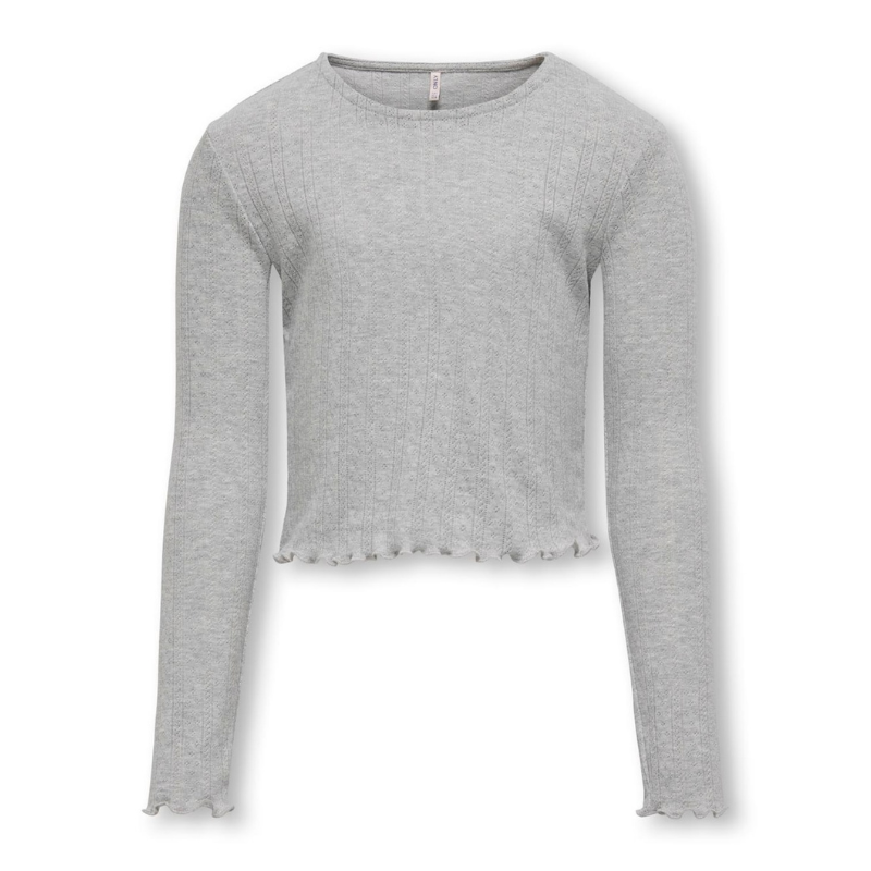 Mega fin basic langærmet bluse fra Kids Only. Blusen har en rund hals, et fint hulmønster samt flæsedetalje ved håndledet og taljen.