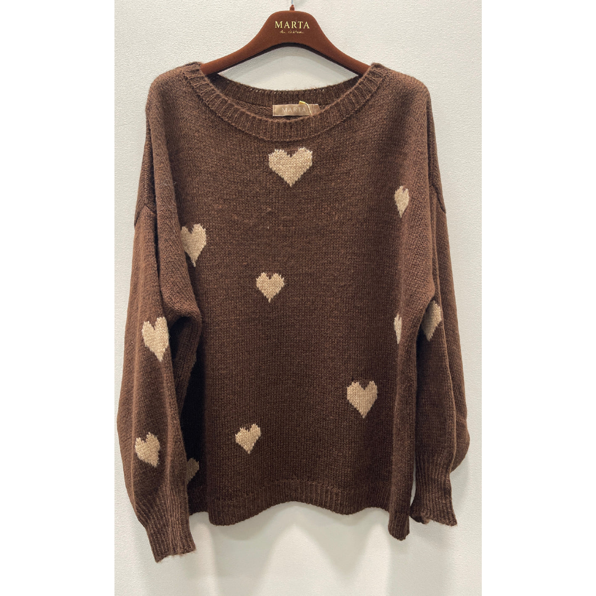 Lækker strik fra Marta. Strikken har en rund hals, en behagelig pasform, hjerter fordelt på strikken samt ribkant detaljer ved alle afslutingerne. Materiale: 50% Akryl. 30% Polyamid. 10% Uld. 10% Viskose. Vaskeanvisning: Vaskes ved 30 grader.