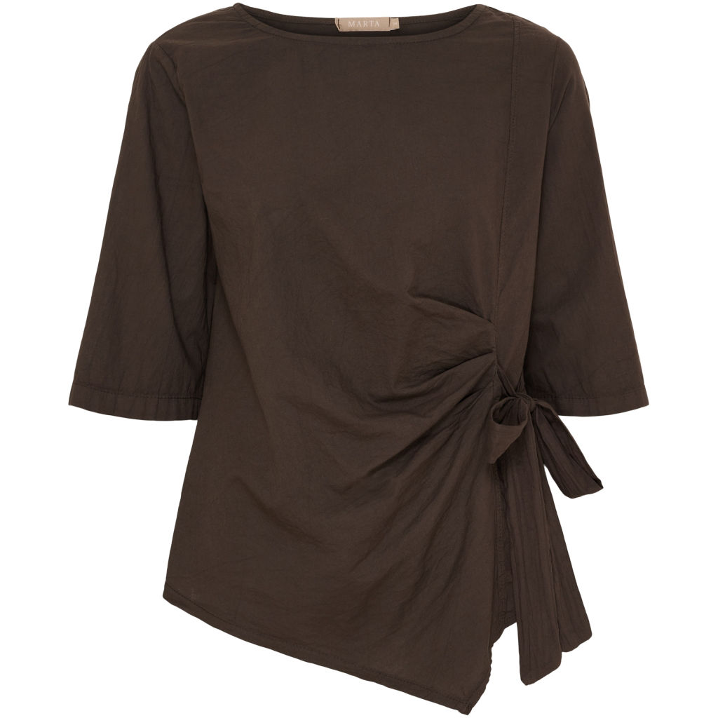Flot bluse fra Marta. Blusen har en rund halsudskæring, bindebånd i venstre side samt ærmer de går til albuerne. Materiale: 100% Bomuld. Vaskeanvisning: Vaskes ved 30 grader.