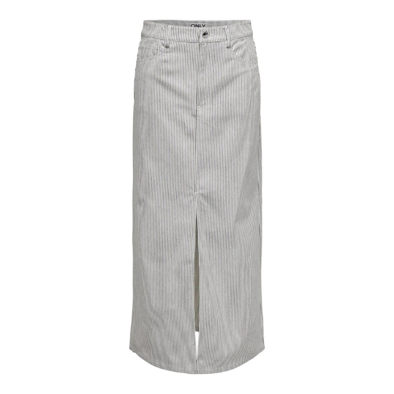 Cool stribet denimnederdel med en åben slids foran. Nederdelen har lommer og bæltestropper foran. Derudover lukkes nederdelen med en knap og lynlås.