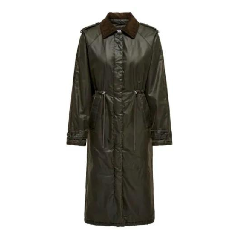 Mega jakke fra Only. Jakken er lang, kan spændes ind i taljen og lukkes med lynlås. Derudover har den to lommer foran og et slids bagtil.