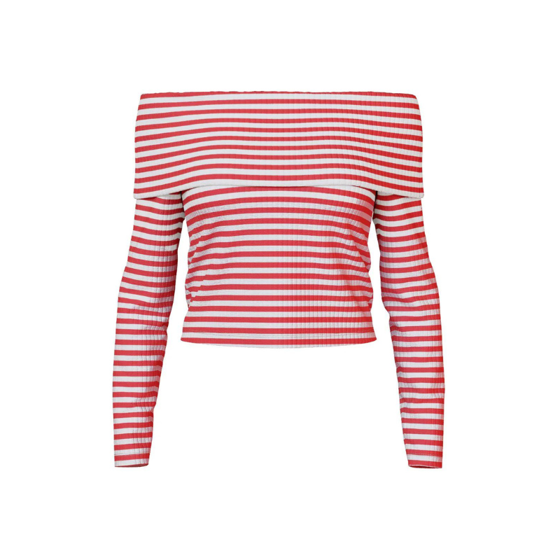 Cool bluse fra Pieces. Blusen er off shoulder, tætsiddende, har en foldet kant, rillet stof og striber.