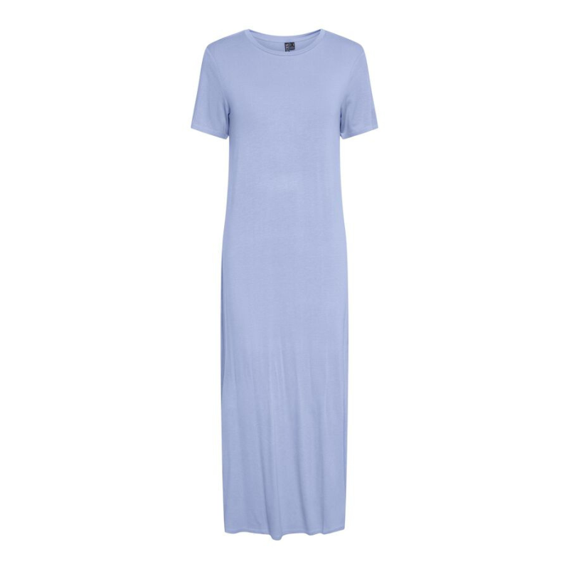 Lang, løs og strækbar kjole med t-shirt ærmer, rund hals og slids i begge sider, fra Pieces.