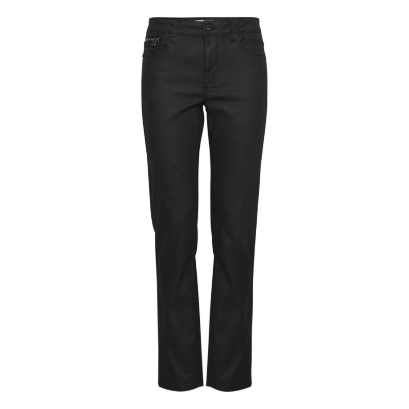 Super smarte læder-look-bukser med straight leg. Bukserne har fire lommer, og i en af lommerne foran sidder der en lynlås, som kan åbnes til endnu lomme. Bukserne har en masse stræk, og de sidder rigtig godt, når de kommer på.