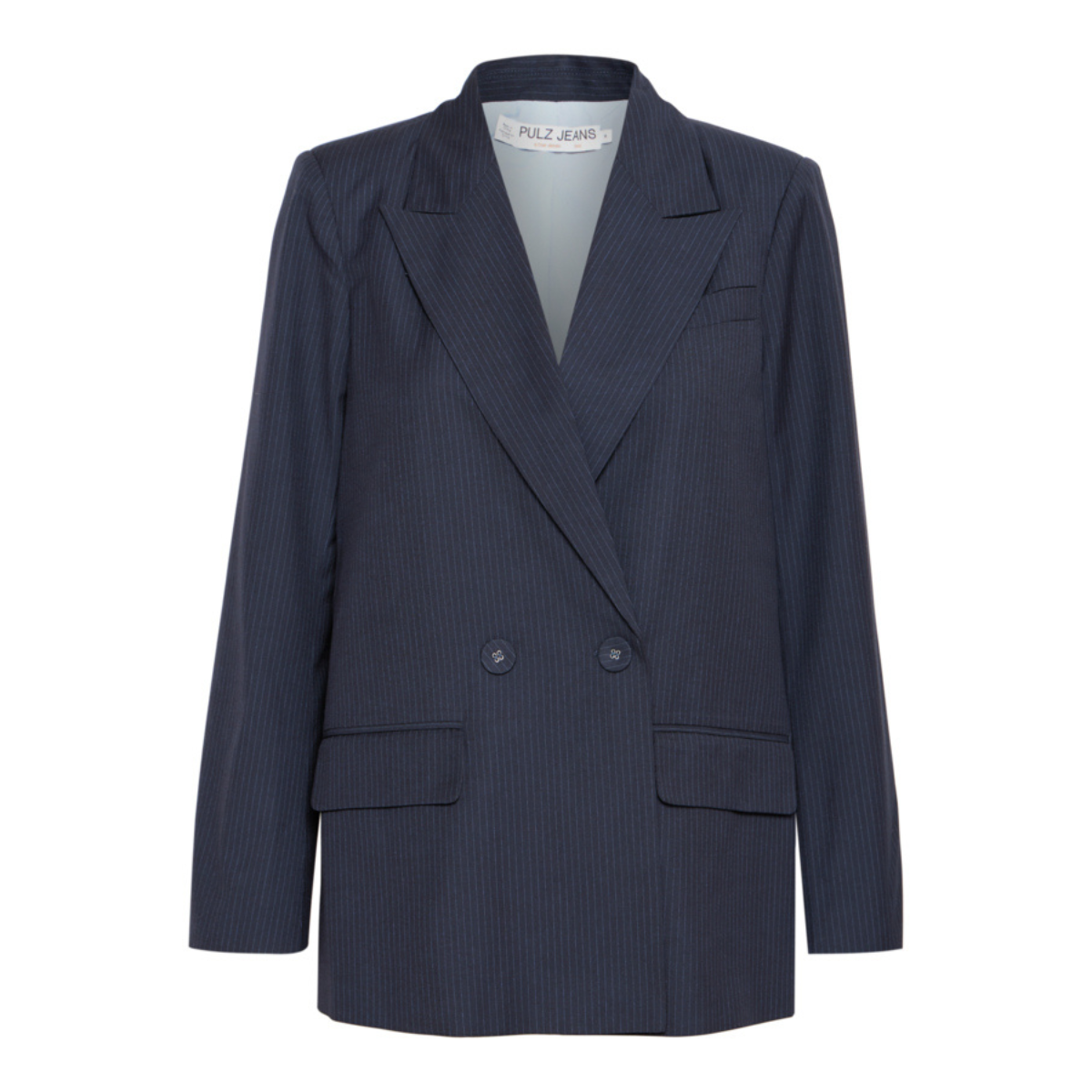 Super cool blazer fra Pulz. Den har skulderpuder, nålestriber, klassisk krave samt en cool pasform og fede detaljer.
