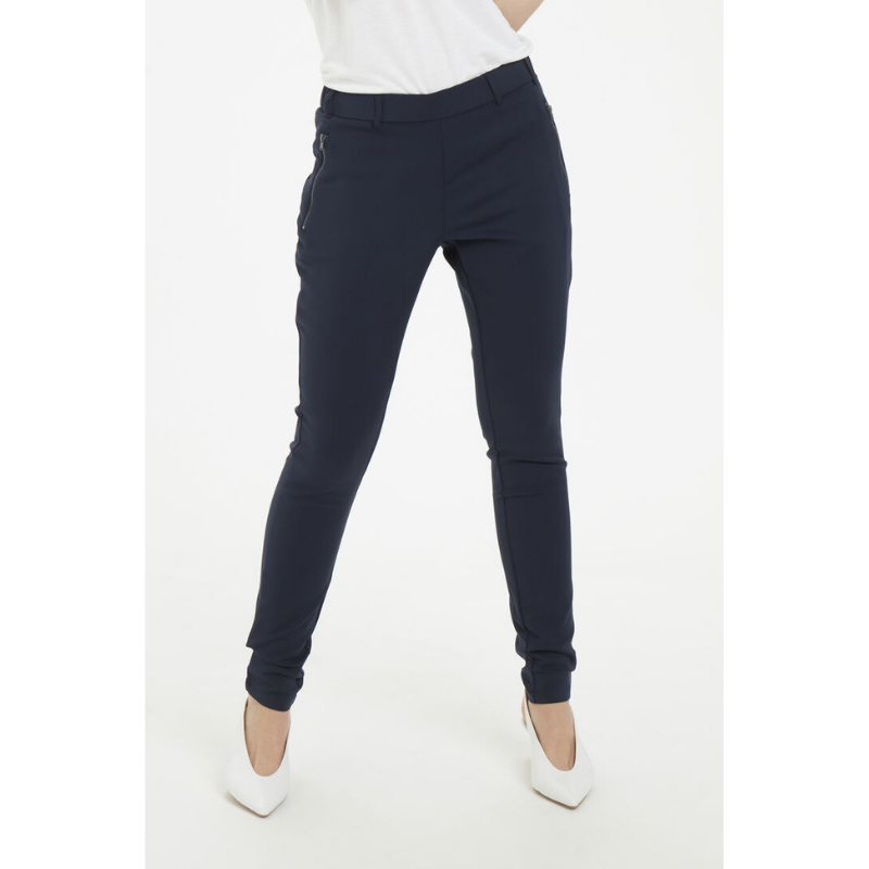 Lækker buks fra Kaffe med fede lynlås detaljer. Buksen har elastik i livet, men der er mulighed for at sætte bælte i bussen hvis det ønskes. Buksen har lige ben, og falder super flot på.