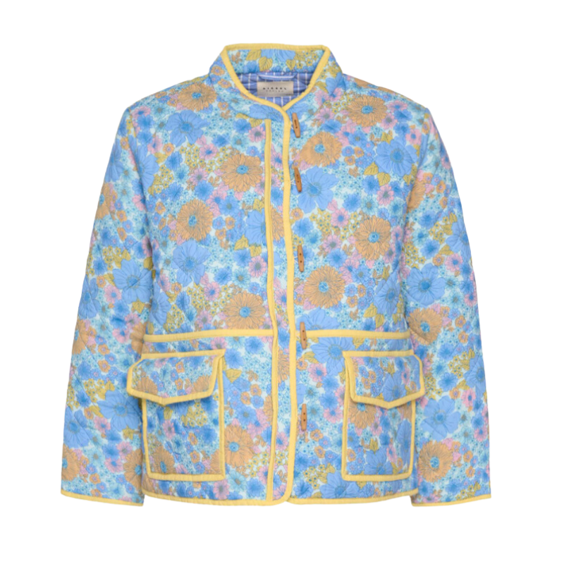 Super smuk jakke fra Sissel Edelbo. Jakken er let vatteret og quiltsyet. Jakken har en lille krave, er lavet med lommer foran og træknapper i stolpe foran. Alle kanter er flot dækket med bomuldsbindinger. Denne jakke er lavet i en smuk blanding af printede rester af bomuldsstoffer.