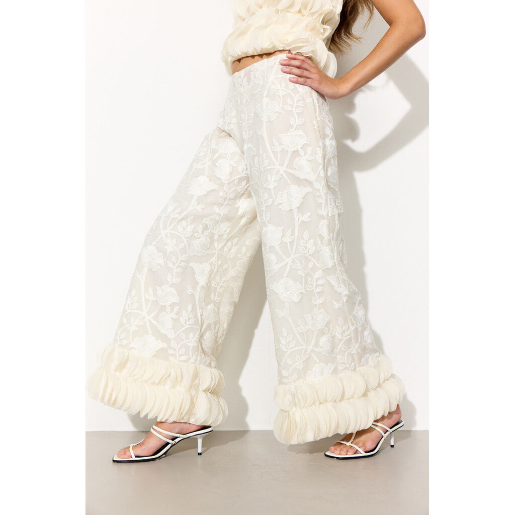 Hunkøn Aiko bukser er elegante bukser med brede ben i et gennemsigtigt stof prydet med blomsterbroderi. Bukserne er fuldt foret og hat flotte detaljer i slutningen af bukserne. Kan styles med den matchende bluse.