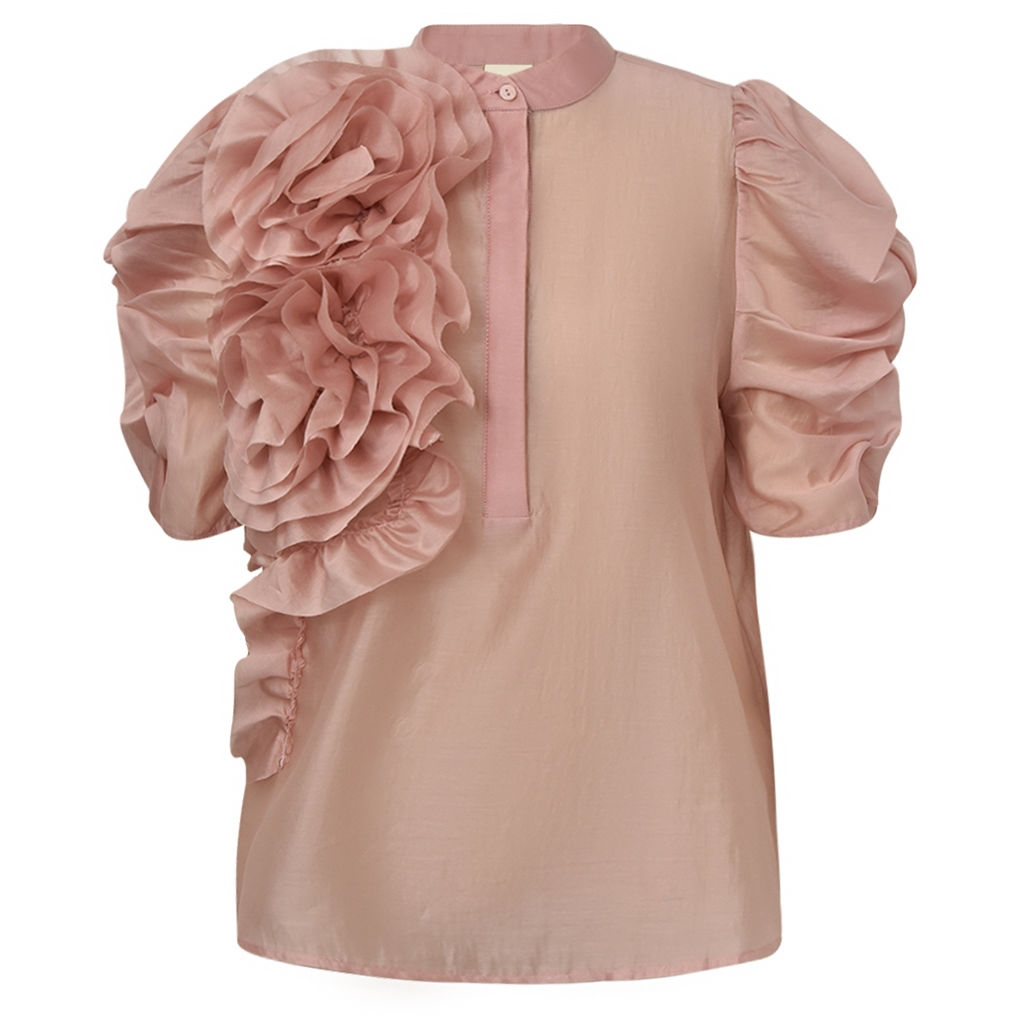 Smuk bluse fra Gossia. Blusen har korte ærmer med en markant puff effekt, en høj hals der lukkes med en knap foran samt en meget flot og stor blomst på den ene side.