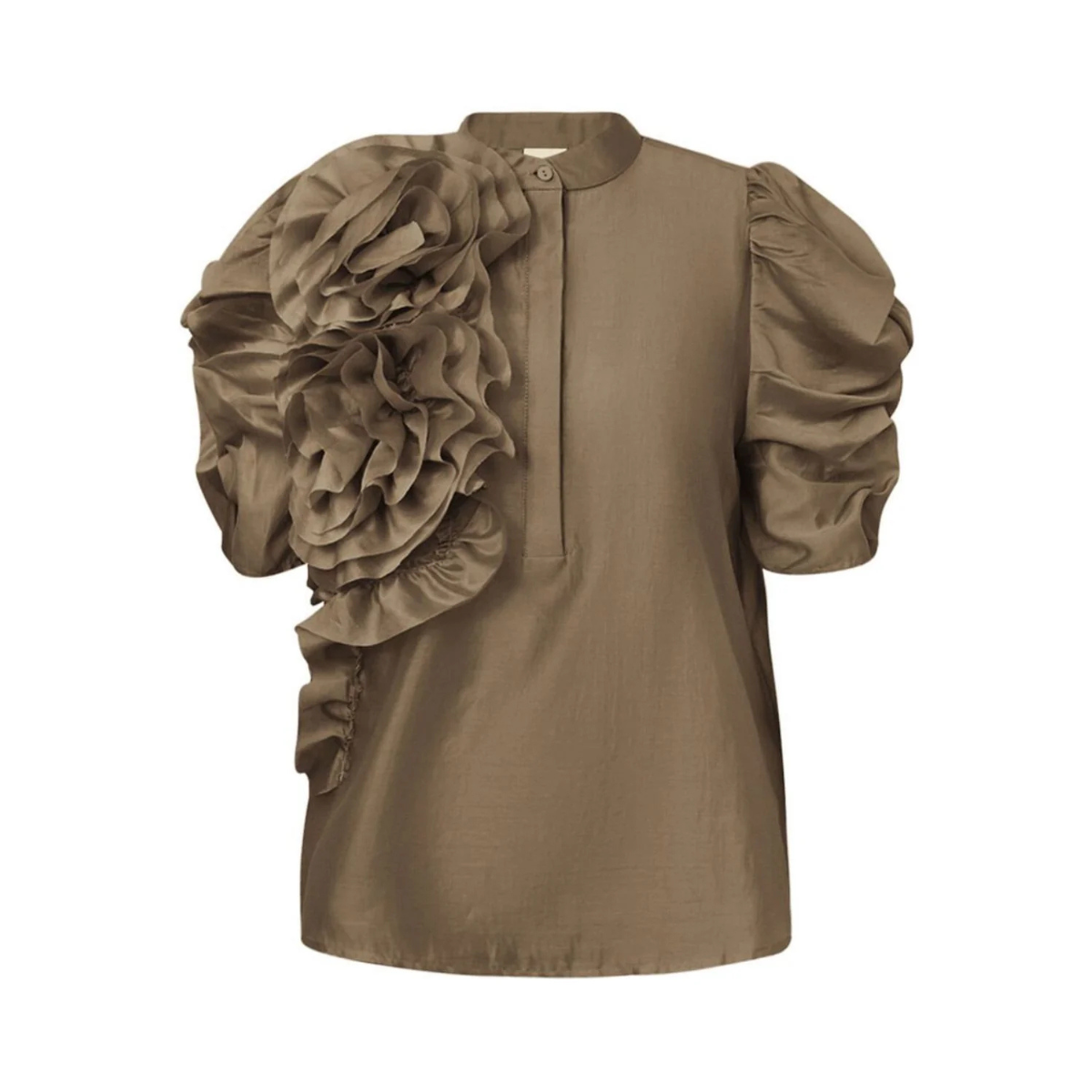 Smuk bluse fra Gossia. Blusen har knaplukning, pufærmer samt flotte blomster detaljer fortil.