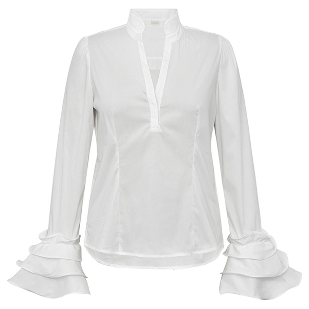 Elegant skjorte fra Gossia. Skjorten er med V-udskæring og lange ærmer med store flæser ved ærmeafslutningen. Derudover er den figursyet samt har en flæsedetalje ved ryggen.