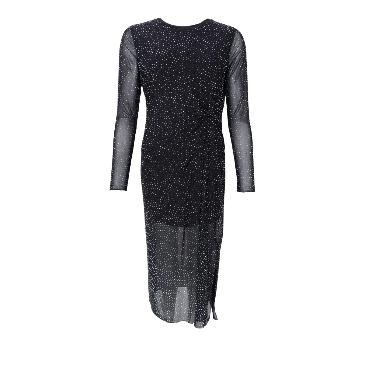 Skøn mesh kjole fra Black Colour. Kjolen har en rund hals, lange ærmer, en tætsiddende pasform samt har en inderkjole. Derudover har den en fin snoet detalje i venstre side samt en masse rhinsten.
