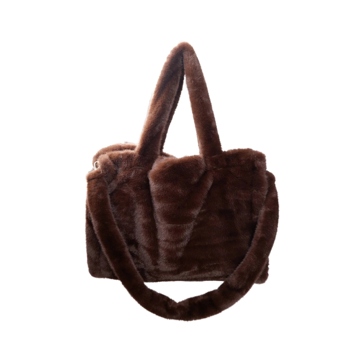 Cool stor taske fra Black Colour. Tasken er i falsk pels, med ét stort rum som lukkes af en knap, har to korte remme samt en lang.