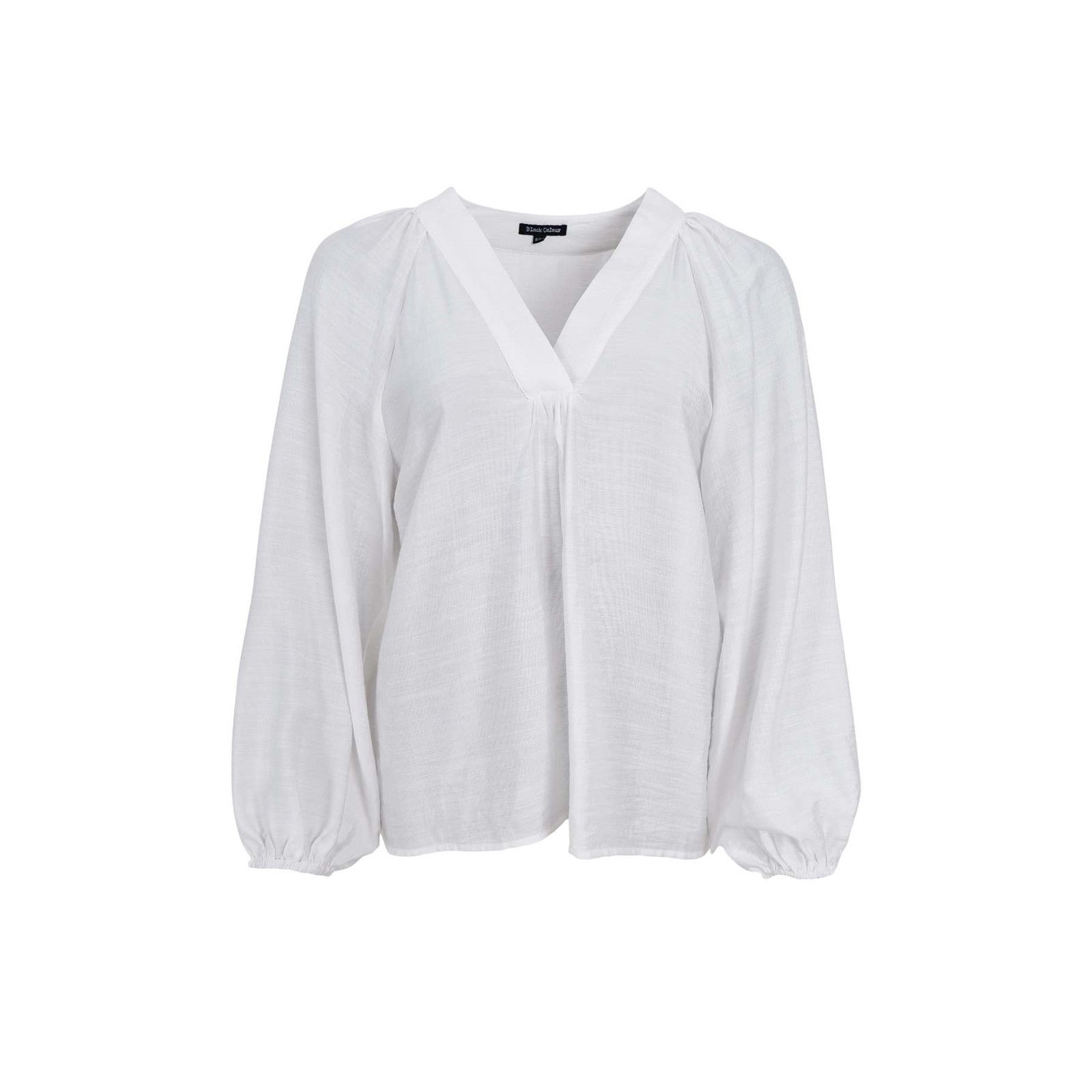Smuk ensfarvet bluse med løse ærmer. Blusen har v-udskæring og løst fald. Materialerne er 20% polyester og 80% viskose.
