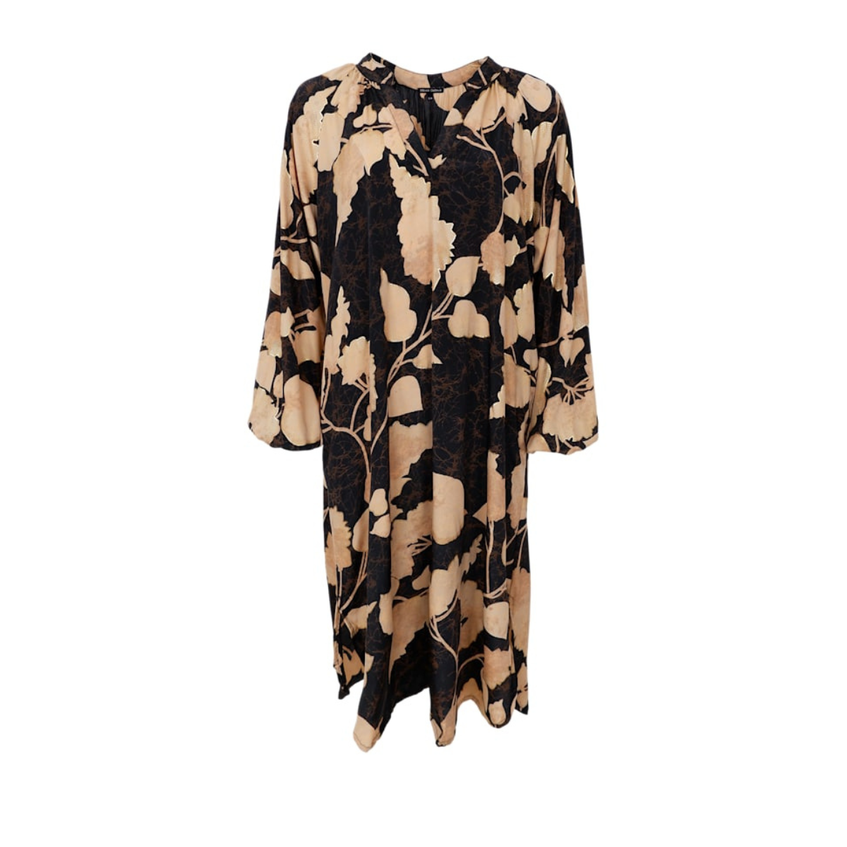 Flot lang kjole fra Black Colour. Kjolen har en V-udskæring og lange ærmer med en elastik forenden. Derudover er den løs i pasformen samt har et flot mønster.