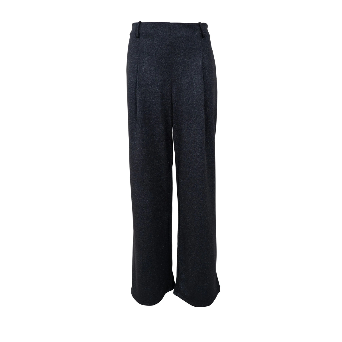 Cool glimmerbuks fra Black Colour. De har elastik bagpå i taljen, bæltestropper, skrålommer samt brede ben. Materiale: 95% Polyester. 5% Elastan. Vaskeanvisning: Vaskes ved 30 grader.