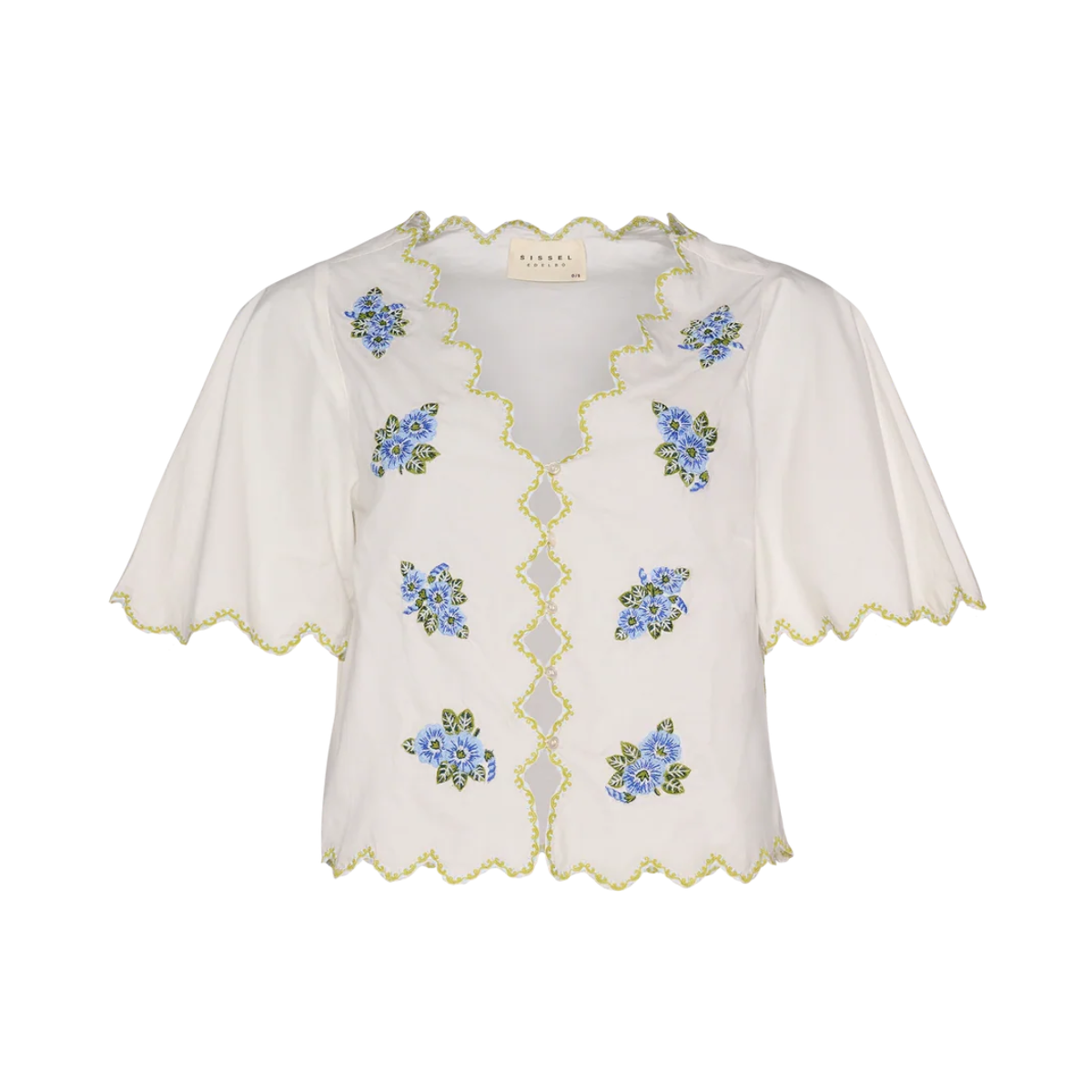 Skøn top fra Sissel Edelbo. Toppen har V-hals, ærmer der går til albuen samt en løs pasform. Derudover er den gennemknappet og har smukke broderinger.