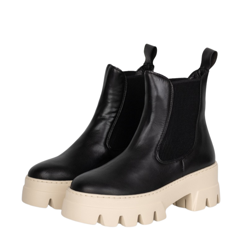 Super sej støvle i sort læder med en lækker chunky plateau sål. Støvlen har elastik i siderne, så den er nem at komme i og sidder behageligt på foden.