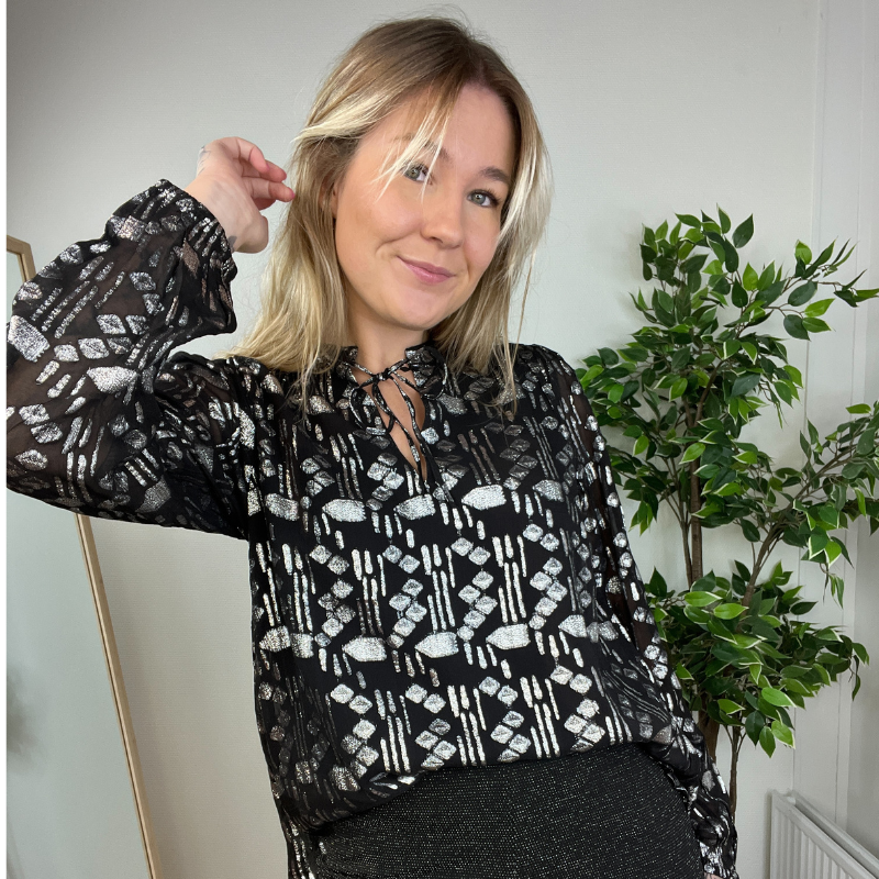 Super flot skjorte fra Mbym. Skjorten har v-udskæring med bindebånd, ved halsen. Den har elastik forenden af ærmet og har flotte detaljer i søvl.
