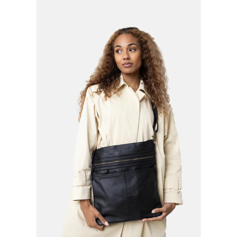 Cindi Big er en stor crossover taske med fede detaljer. Tasken har to frontlommer, den ene med skjult metallynlås den anden med en synlig metallynlås. Hovedrummet lukkes med en metallynlås og har en lille lynlåslomme i foret og to åbne lommer, der passer til din telefon og nøgler. Den har en aftagelig og justerbar crossover-rem.