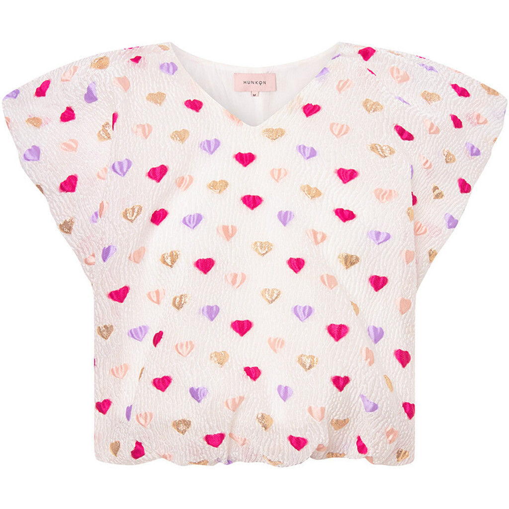 Super fin top fra Hunkøn. Toppen har V-udskæring, store skulder i crepe og et sødt hjerte mønster.
