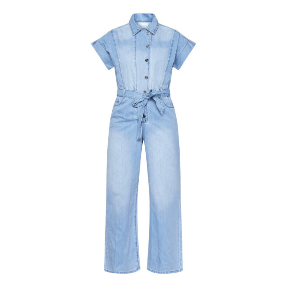 Flotteste buksedragt fra SisterS Point. Den er i denim-look med korte ærmer, krave og gennemgående knaplukning foran. Den er justerbar i taljen med bindebånd og har lommer bagtil.