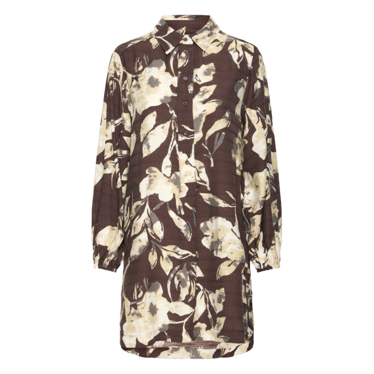 Sød kjole fra Fransa. Kjolen har en rund halsudskæring, knaplukning fortil samt elastik forenden af ærmerne. Derudover har den et flot blomster design. Materiale: 80% Viskose. 20% Polyamid. Vaskeanvisning: Vaskes ved 30 grader.