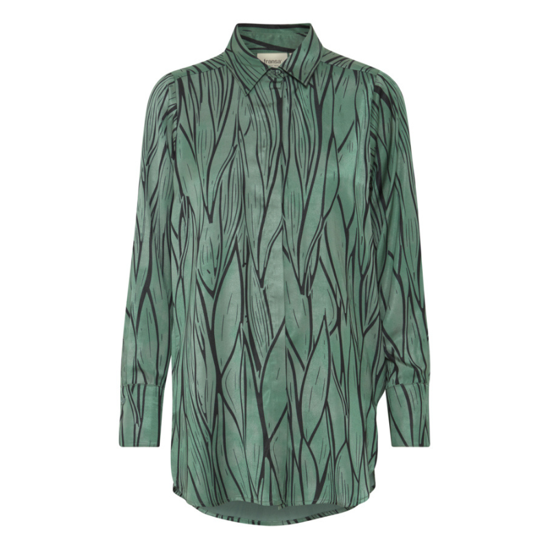 Mega sej skjorte fra Fransa. Skjorten er gennemknappet, den er længere bagtil end fortil og løs i pasformen.