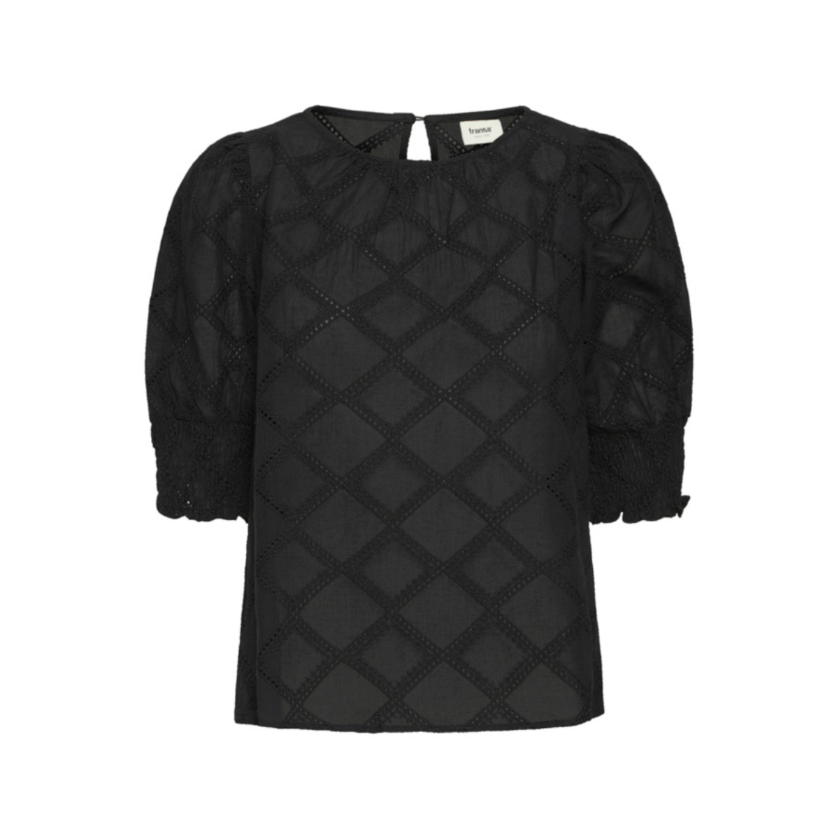 Fineste bluse fra Fransa. Blusen har en rund hals og et flot hulmønster. Derudover har den korte ærmer med smock og flæser forenden. Materiale: 100% Bomuld. Vaskeanvisning: Vaskes ved 30 grader.