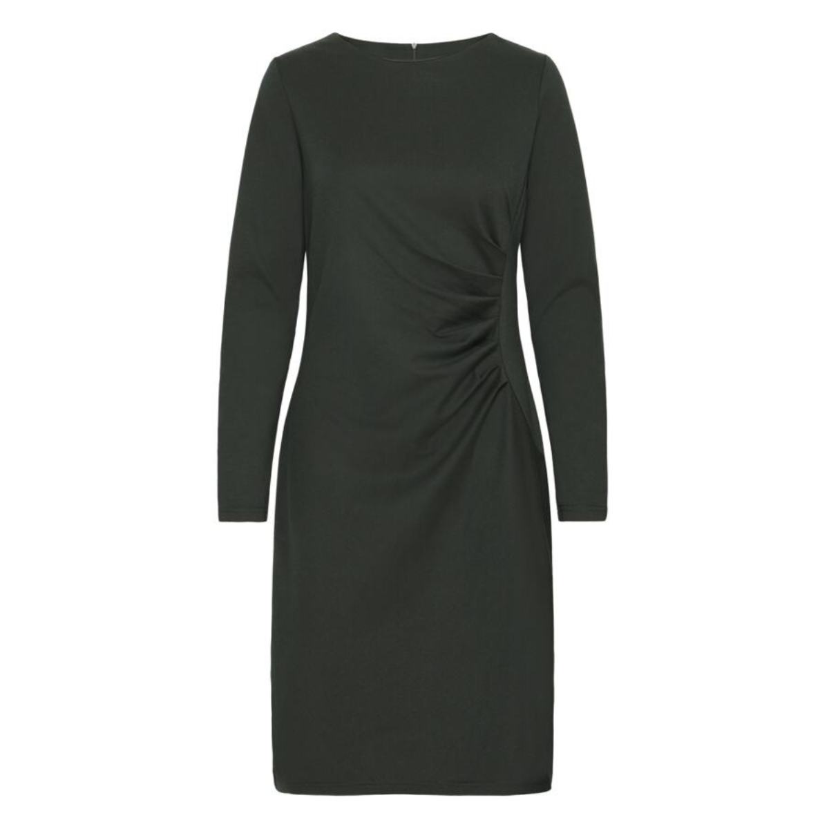 Elegant kjole fra Fransa. Kjolen har lange ærmer, en rund halsudskæring, lynlåslukning på ryggen samt går til omkring knæet. Derudover har den en rynkeeffekt i den ene side.