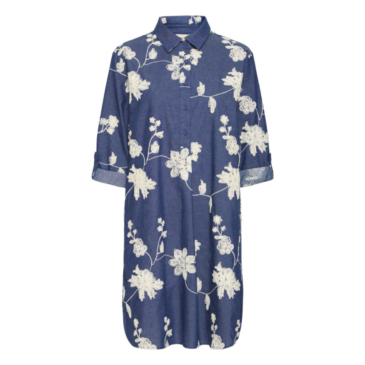 Super sød kjole fra Fransa. Kjolen har en rund hals med en klassisk skjortekrave, knaplukning samt lange ærmer. Derudover er der broderier fordelt på hele kjolen.