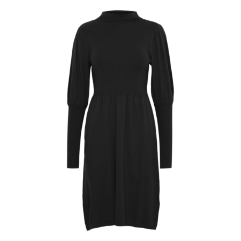 Fin strikkjole med høj hals, ballonærmer og en god længde.