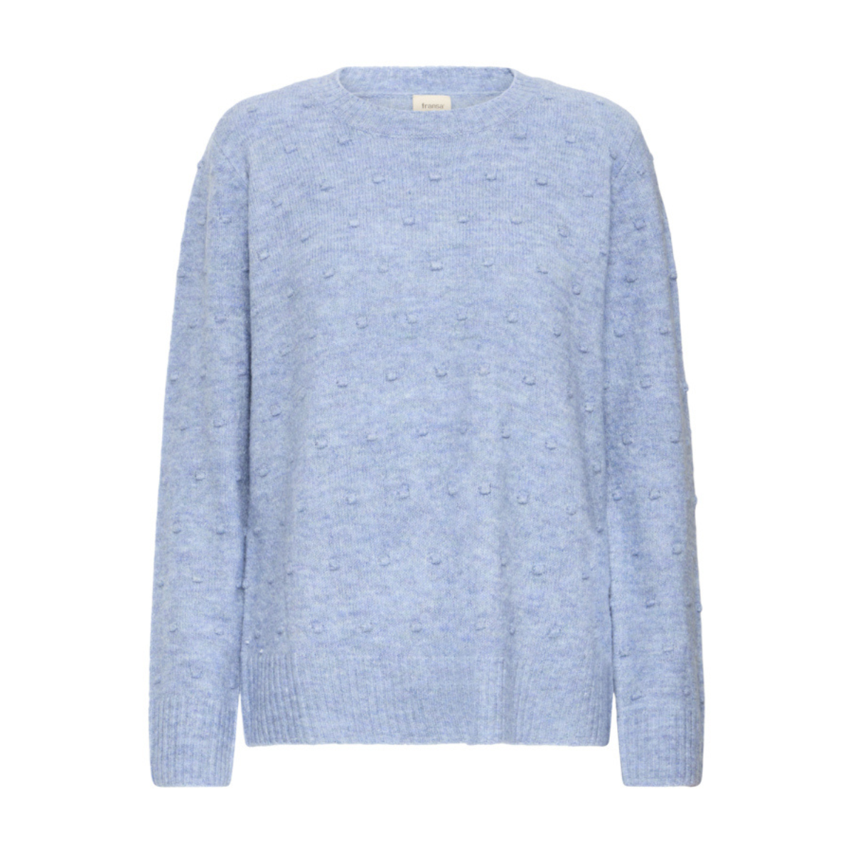 Sød strik fra Fransa. Strikken har en rund halsudskæring, ribkant i alle afslutninger samt dots fordelt på hele strikken. Materiale: 74% Akryl. 22% Polyester. 4% Elastan. Vaskeanvisning: Vaskes ved 30 grader.