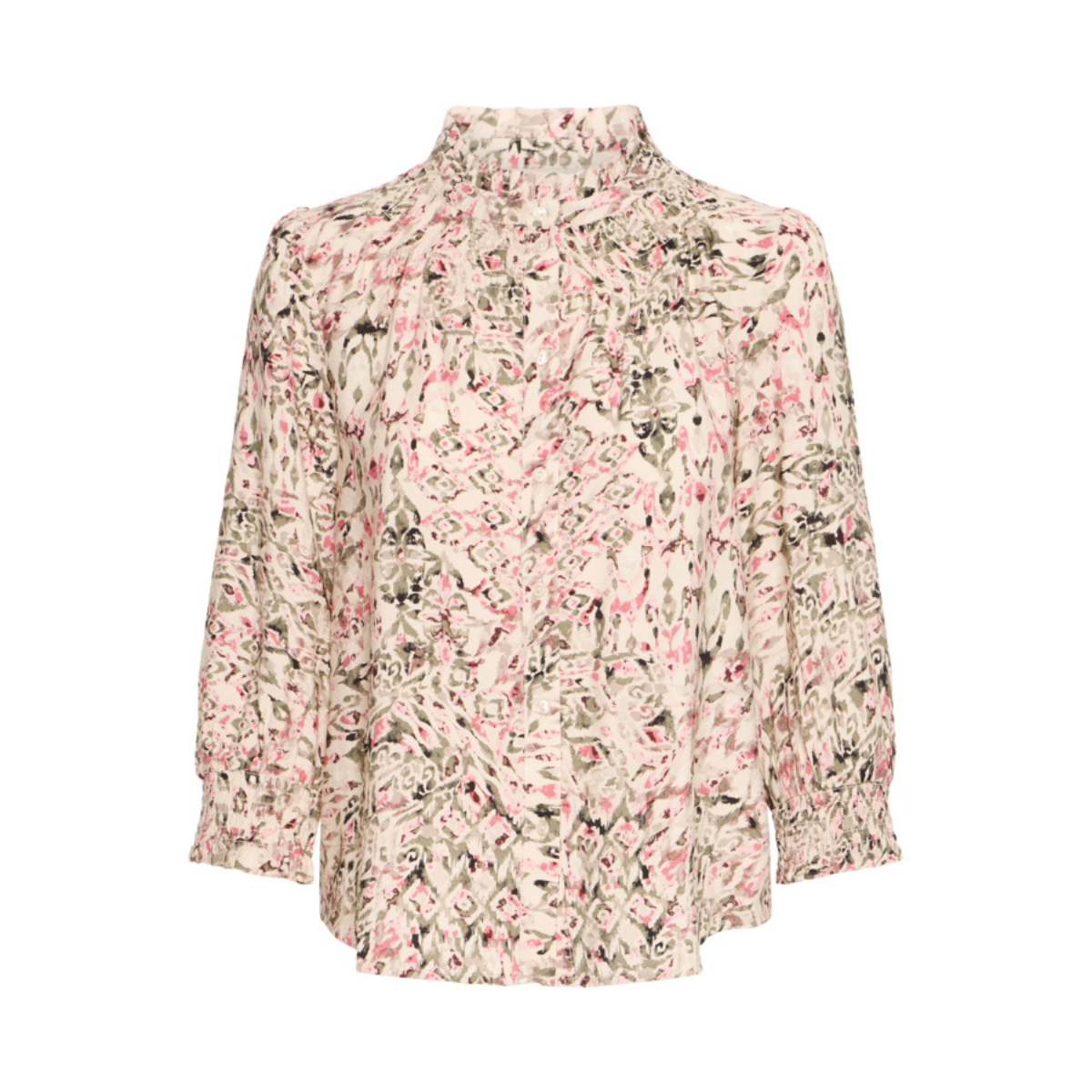 Mega fin skjorte fra Gossia. Skjorten er gennemknappet, har lange ærmer med smock forenden samt en fin flæsekrave og mønster.