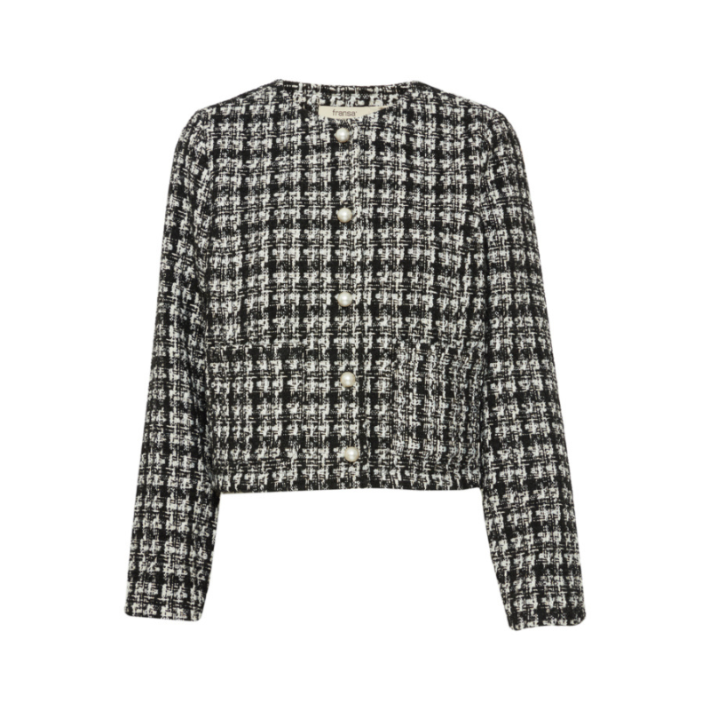 Mega sej jakke fra Fransa. Jakken har en rund halsudskæring, er gennemknappet med store perler. Derudover har den to store lommer foran.