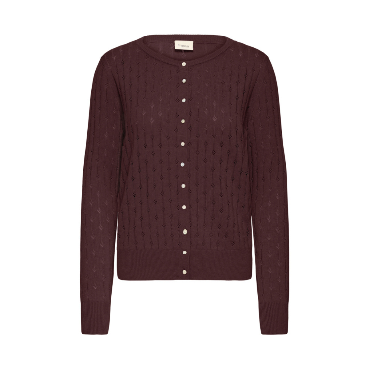 Sød cardigan fra Fransa der er gennemknappet, har lange ærmer samt et hulmønster fordelt på hele cardigan. Materiale: 60% Viskose. 40% Bomuld. Vaskeanvisning: Vaskes ved 30 grader.
