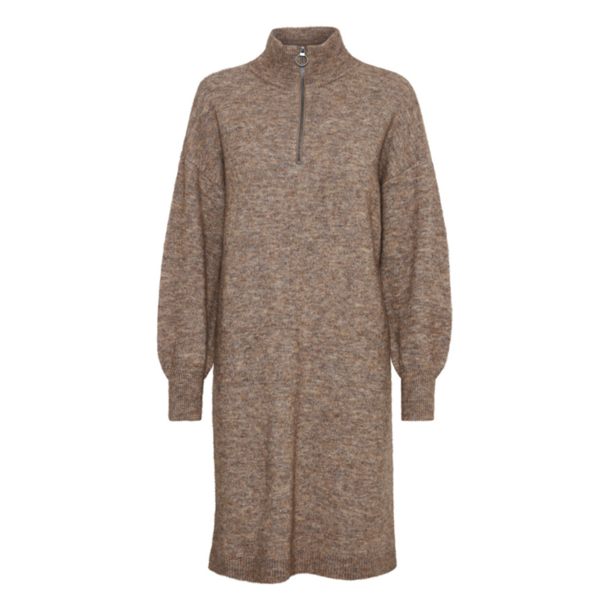 Lækker strikkjole fra Fransa. Kjolen har en lynlås-detalje ved kraven, lange løse ærmer samt ribkant detaljer ved alle afslutninger.