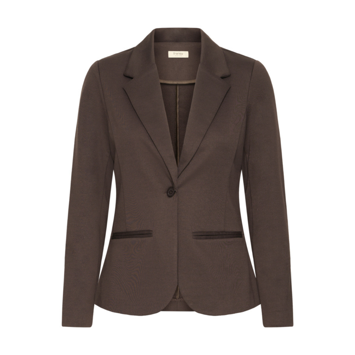 Skøn blazer fra Fransa med pyntelommer, skulderpuder, krave og én knap til lukning. Blazerens pasform er tætsiddende.