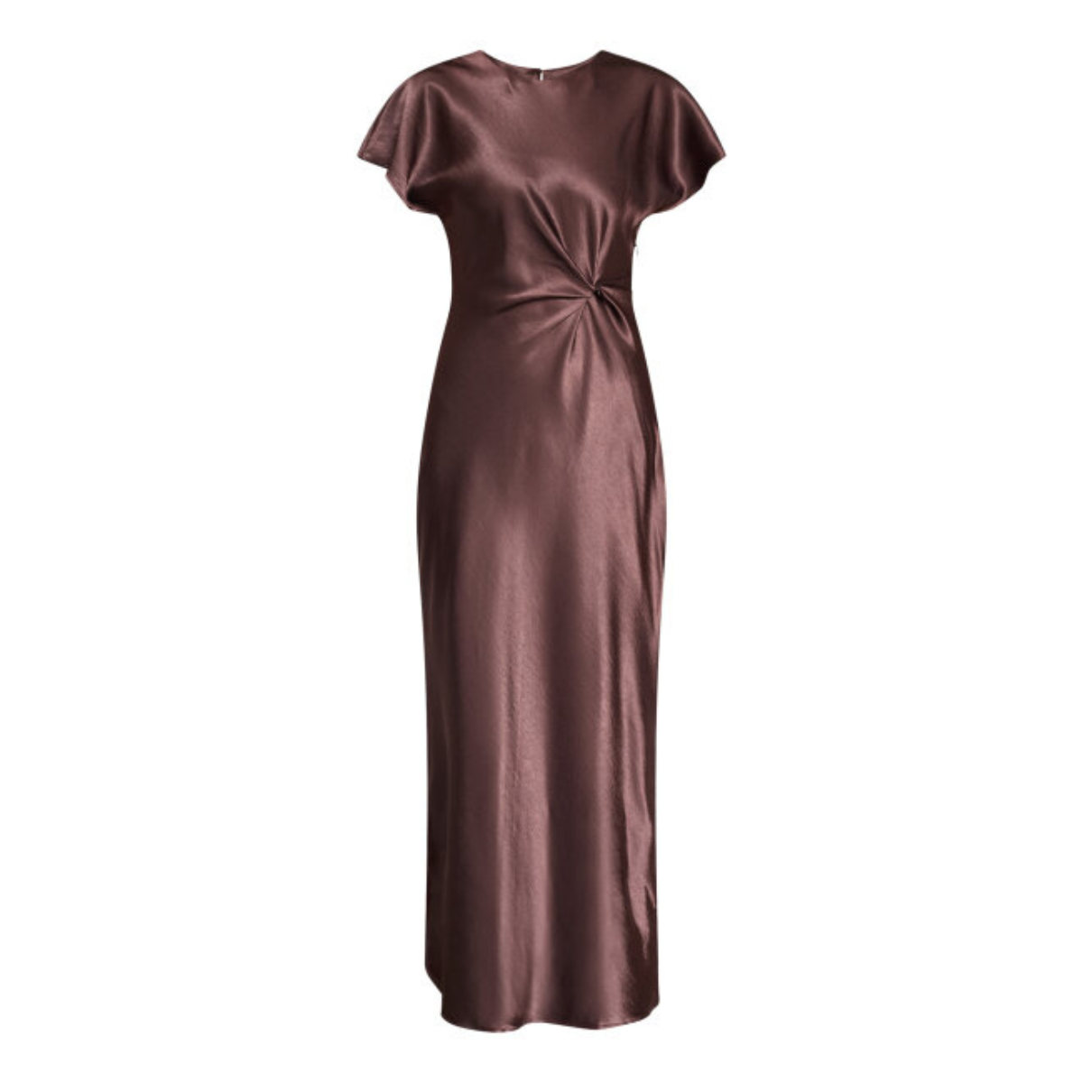 Smuk lang kjole fra SisterS Point. Kjolen er i et skinnende materiale, har korte ærmer, en rund halsudskæring samt en fin snoet detalje i venstre side.